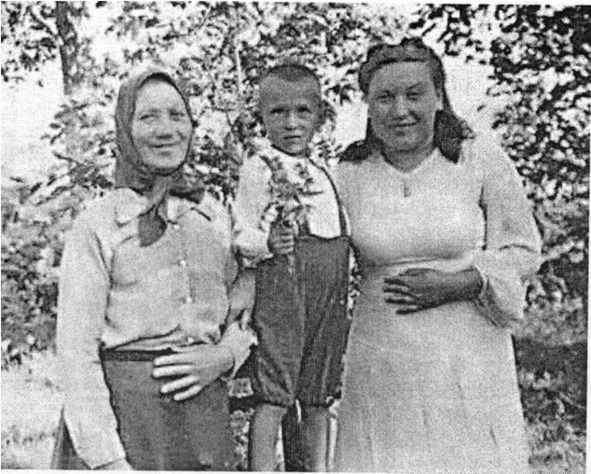 А вот и документальное свидетельство раннего детства – снимок, сделанный каким-то любителем в нашем огороде летом 1946 года. Я, коротко остриженный «оголец» в белой рубашонке и коротких, застёгнутых на пуговичку под коленками, штанишках на помочах, стою на стуле и держу в правой руке букетик полевых цветов. Слева от меня – мать в светлом шёлковом платье с длинными пышными рукавами, её длинные, подвитые на концах по моде послевоенных лет волосы ниспадают на плечи, правой рукой она обнимает меня, а левую прижала к животу. С правого бока ко мне прижалась бабушка, она в неизменном чёрном платочке, клетчатой кофточке и тоже держит левую руку у живота. Мать с бабкой благодушно улыбаются, улыбаюсь и я, но недоверчивой улыбкой человечка, ожидающего то ли от фотографа, то ли от жизни какого-нибудь подвоха.