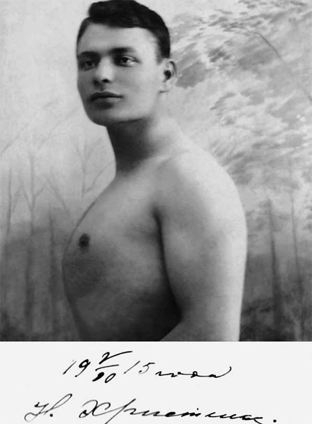 Вернемся к отцу. Приказчиком он был видным, отличался большой физической силой и ловкостью. Любил побаловаться двухпудовыми гирями, перекидывая их из руки в руку. Пудовики двумя руками подбрасывал вверх, ловил их и снова подбрасывал по двадцать раз. Любой прочности упаковочный канат, завязанный какой-то особой петлей вокруг пальцев, рвал без видимых усилий. Было в нем что-то от артиста-циркача. Любил удивить публику каким-нибудь фокусом, построенным на силе и ловкости. Очень любил. На одной из фотографий он снят в мае 1915 года обнаженным по пояс. Демонстрирует атлетическую грудь. Точно помню: объем его груди в спокойном состоянии при полном выдохе – 114 сантиметров, а при вдохе – 118. Вот так. Заставляя меня делать упражнения, говорил: «Грудь для человека-борца – самое главное!»