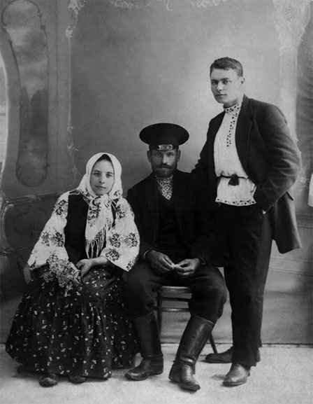 Отправляя в дальнюю дорогу неродного сына, мачеха снизошла, решив увековечить себя и всю свою семью на фотографии. Для этого все съехались в Полтаву. На фотографии, сохранившейся с тех времен, запечатлены образы крепких крестьян в добротных сапогах и неизносимых костюмах: отец отца и мачеха. Мачеху звали Клеопатра. Есть карточка, на которой отец снят с сестрой. Как звали сестру, я не установил. Была ли она родной отцу, не знаю. Есть еще одна фотография, на которой отец с сестрой сняты вдвоем. Обе фотографии подписаны самой Клеопатрой – «10 мая 1915 г.».