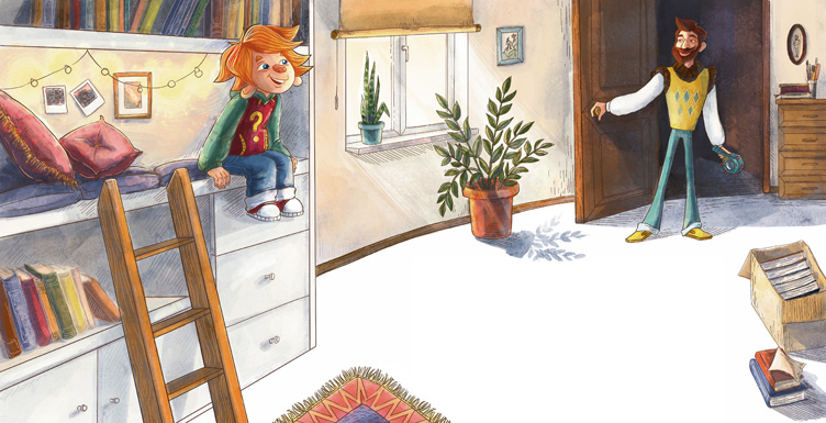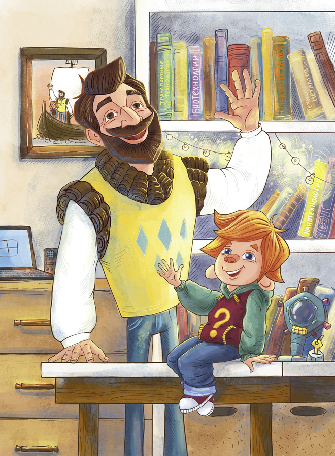 Здравствуйте, ребята! Меня зовут Чевостик. Я живу на книжной полке в библиотеке у дяди Кузи. Не удивляйтесь: я небольшого роста, а нижняя полка в книжном шкафу дяди Кузи очень высокая и просторная, поэтому мне на ней хорошо и удобно. Какой я? Похож на обыкновенного мальчишку, волосы рыжие, характер весёлый. Дядя Кузя в шутку зовёт меня Чевочкой с хвостиком. Но никакого хвоста у меня нет, зато есть ушки на макушке. Больше всего на свете я люблю узнавать новое, поэтому всё время задаю дяде Кузе всякие вопросы. О чём бы я ни спросил, он всё знает и мне рассказывает. Это потому, что дядя Кузя очень умный. Он прочитал много-много разных книг. А ещё мы с ним любим путешествовать! В путешествиях нам помогает времяскок. Это такой прибор, его дядя Кузя изобрёл. Набираешь на времяскоке место и время, куда хочешь попасть, раз, два – и уже там! Сегодня мы наверняка тоже куда-нибудь отправимся!