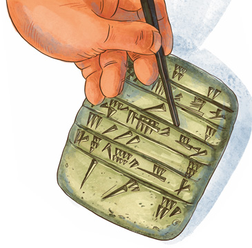 – Ну, например, на глиняных табличках. На пластинках из мягкой глины заострёнными деревянными палочками выдавливали знаки, которые обозначали слова.