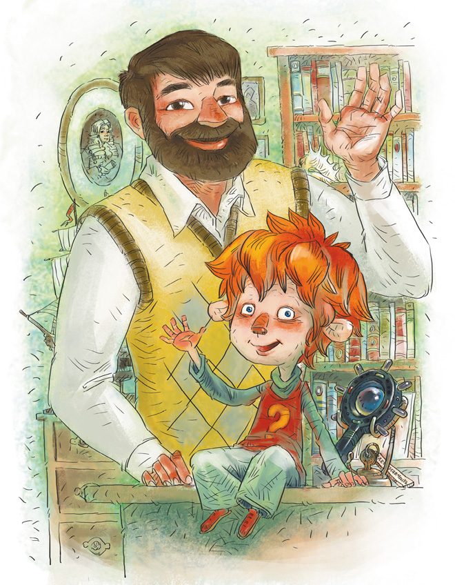 Здравствуйте, ребята! Меня зовут Чевостик. Я живу на книжной полке в библиотеке у дяди Кузи. Не удивляйтесь, я небольшого роста, а нижняя полка в книжном шкафу дяди Кузи очень высокая и просторная, поэтому мне на ней хорошо и удобно. Какой я? Похож на обыкновенного мальчишку, волосы рыжие, характер весёлый. Дядя Кузя в шутку зовёт меня Чевочкой с хвостиком. Но никакого хвоста у меня нет, зато есть ушки на макушке. Больше всего на свете я люблю узнавать новое, поэтому всё время задаю всякие вопросы дяде Кузе. О чём бы я ни спросил, он всё знает и мне рассказывает. Это потому, что дядя Кузя очень умный. Он прочитал много-много разных книг. А ещё мы с ним любим путешествовать! В путешествиях нам помогает времяскок. Это такой прибор, его дядя Кузя изобрёл. Набираешь на времяскоке место и время, куда хочешь попасть, раз, два – и уже там! Сегодня мы наверняка тоже куда-нибудь отправимся!