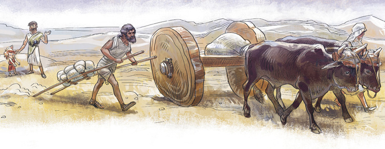 – Конечно, Чевостик! Изобретение колеса оказалось очень важным и нужным шагом для развития всего человечества. Когда люди совершили это открытие, они додумались насадить два колеса на палку – ось, а сверху приделали настил из деревяшек. Так получилась повозка. Осталось только впрячь в неё быков, а впоследствии и лошадей, усадить возницу, который будет править, – и первое транспортное средство готово.