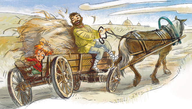 – Это хорошо. А то из нашей телеги высыпалось бы всё сено, а на нём так мягко ехать. Правда, мне эта поездка всё равно не очень-то нравится. Уж слишком трясёт телегу на ухабах, да и едем мы еле-еле. Неужели в эти времена все люди так путешествовали?