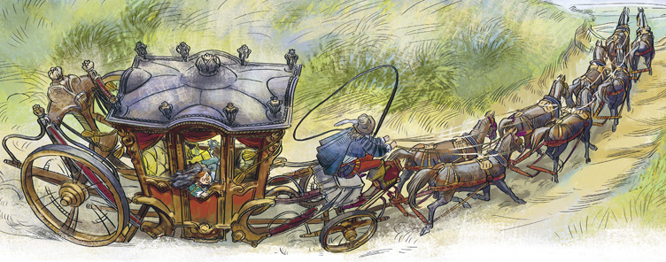 – Мы в королевской карете. Кучер – так называют человека, который правит каретой, – едет за королём во дворец. Карета движется быстро, потому что в неё впряжено сразу восемь лошадей. Чтобы все они могли везти одну карету, люди придумали упряжь. Это целая система из кожаных ремней. Её части надеваются на каждую из лошадей, а концы упряжи крепятся к передней части кареты.