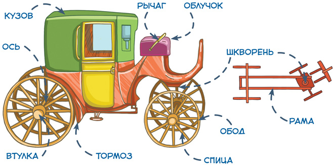 – Думаю, ты не совсем прав, малыш. В конце нашего путешествия ты убедишься, что все главные части повозки, правда в очень изменённом виде, есть и в современном автомобиле.