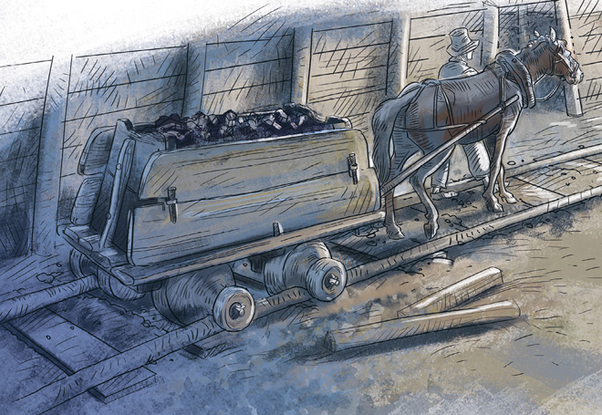 – Куда мы попали, дядя Кузя? Кругом горы. Вижу лошадь, она тянет по рельсам маленькие вагончики с камнями.