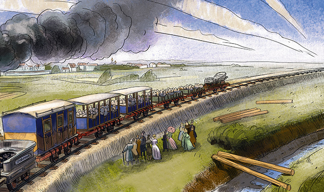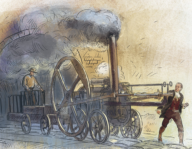 – А поезда нужны для дальних поездок, между городами. Они могут перевозить очень много грузов и людей. Первый паровоз построил и испытал английский изобретатель Ричард Тревитик в самом начале XIX века, в 1803 году. А в феврале 1804 года он провёл состав, который двигался со скоростью восемь километров в час и вёз 10 тонн железа и целых 70 человек!