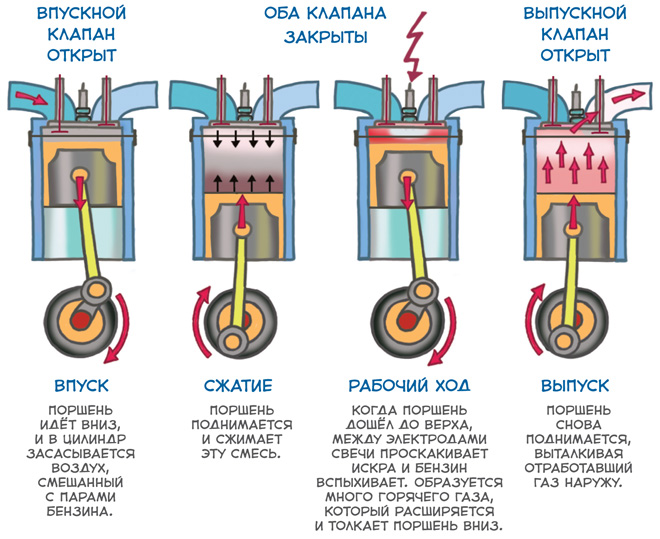 Устройство и работа четырёхцилиндрового двигателя внутреннего сгорания