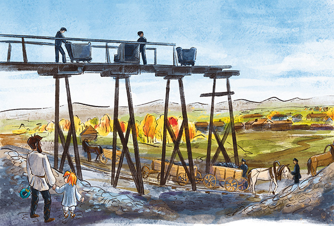 – Это Змеиногорск. Здесь работает один из Колывано-Воскресенских заводов. Все эти заводы принадлежат семье Демидовых. Здесь есть рудник, где добывают серебряную руду. Это как раз те камни, которые ты видишь в вагончиках – вагонетках. Руду везут из рудника на завод, где из неё выплавляют серебро. А лошадь тянет вагонетки как раз по железной дороге. Её только что построили. Проект составил горный инженер Пётр Козьмич Фролов, он же руководил её постройкой. Эту железную дорогу назвали чугунно-рельсовой дорогой на конной тяге.