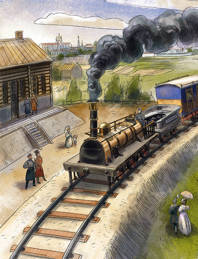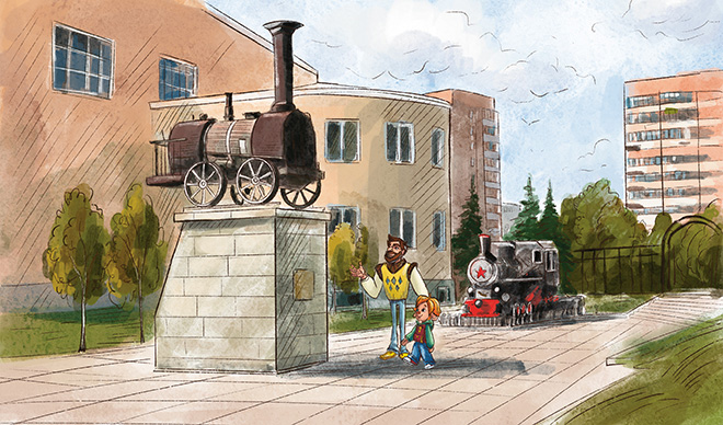 – В то время паровоз в нашей стране ещё не изобрели. Но скоро, в 1834 году, его построят на Выйском железоделательном заводе отец и сын Черепановы. По специально уложенным чугунным рельсам длиной чуть больше 850 метров он сможет возить более трёх тонн груза со скоростью до 16 километров в час. А через год они же построят более мощный паровоз, он сможет перевозить уже больше 16 тонн. В городе Екатеринбурге даже стоит памятник первому российскому паровозу – его точная копия! Кстати, сначала паровоз называли «сухопутный пароход» или «пароходный дилижанец».