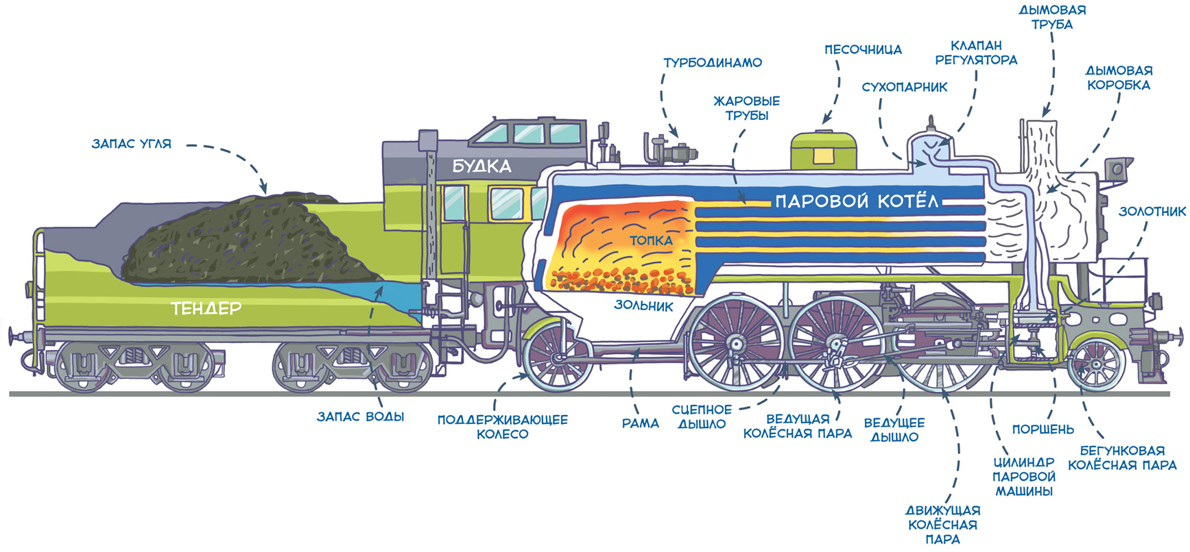 – Нет, Чевостик, кочегары жгут в топке дрова или уголь для того, чтобы в паровом котле закипела вода. Тогда образуется пар, который поступает в специальный цилиндр и приводит в действие паровую машину паровоза.
