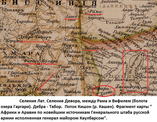 На западном побережье озера на карте ниже, «Карта Африки и Аравии по новейшим источникам генерального штаба русской армии…» (из коллекции РНБ СПБ), находим рядом расположенные селения: Анаха, Иясус, Яхана. Анаха и Яхана это одно и тоже слово, прочитанное или произнесённое слева направо и в обратном направлении. Оба селения расположены на реках, исток которых побережье озера Тана.