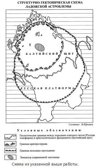 Однако есть мнение (Автор. – В. Юрковец в работе «Ладожская астроблема»), что котловина Ладоги образовалась в результате падения огромного метеорита или астероида. Глубоководная часть озера представляет собой огромный кратер образованного взрывом космического тела диаметром более 80 километров. В результате чего глубоководная часть Ладоги выглядит, как гигантская воронка. Это сходство ещё больше усиливается из-за того, что она имеет почти идеальную круговую форму. Максимальная глубина в районе кратера – немногим более 1000 метров. Примерный размер космического тела 11 км в поперечнике. Внутри кратера взрыва геологические структуры вулканического происхождения указывают на то, что взрыв был настолько мощным, что нарушил монолитность земной коры в месте удара. По образовавшимся трещинам из нижележащего слоя земли на поверхность стала поступать магма. Из-за резкого перепада давления в этом слое, а также огромной температуры, образовавшейся при взрыве, горные породы просто вскипели. Это привело к выбросу в атмосферу в виде вулканического пепла гигантского количества материала, сопоставимого с объёмом образовавшегося понижения – Ладожского озера. Масса изверженного материала составила более триллиона тонн. Тогда гранитные скалы карельского перешейка, побережья Ладоги следствие этого выброса.