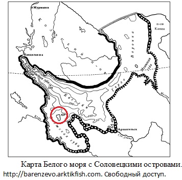 Здесь же Соловецкие острова (красный овал) 35.44 в. д. На карте можно проследить следы разлома в виде Кандалашской губы, реки и озера Колвица, реки Нива, Вялозера, озеро Иматра, реки Умба, Умба озера, реки Тулома, области Русской Лапланди и ("Ловозерской тундры" – а по сути гористой территории посреди огромной равнины) с расположенным здесь Ловозером. Там же остров Роговой – рог, на священным Сейдозере (саам. Сейдъяврь)– 34°51′10″, с высотой поверхности над уровнем моря 189 м, длиной 8 км, шириной до 3 км. В озеро впадает горная река Эльморайок, вытекает река Сейдъяврйок, которая несёт свои воды в Ловозеро. Рядом (севернее) Райозеро. Река Кола, Кольский залив Баренцева моря.
