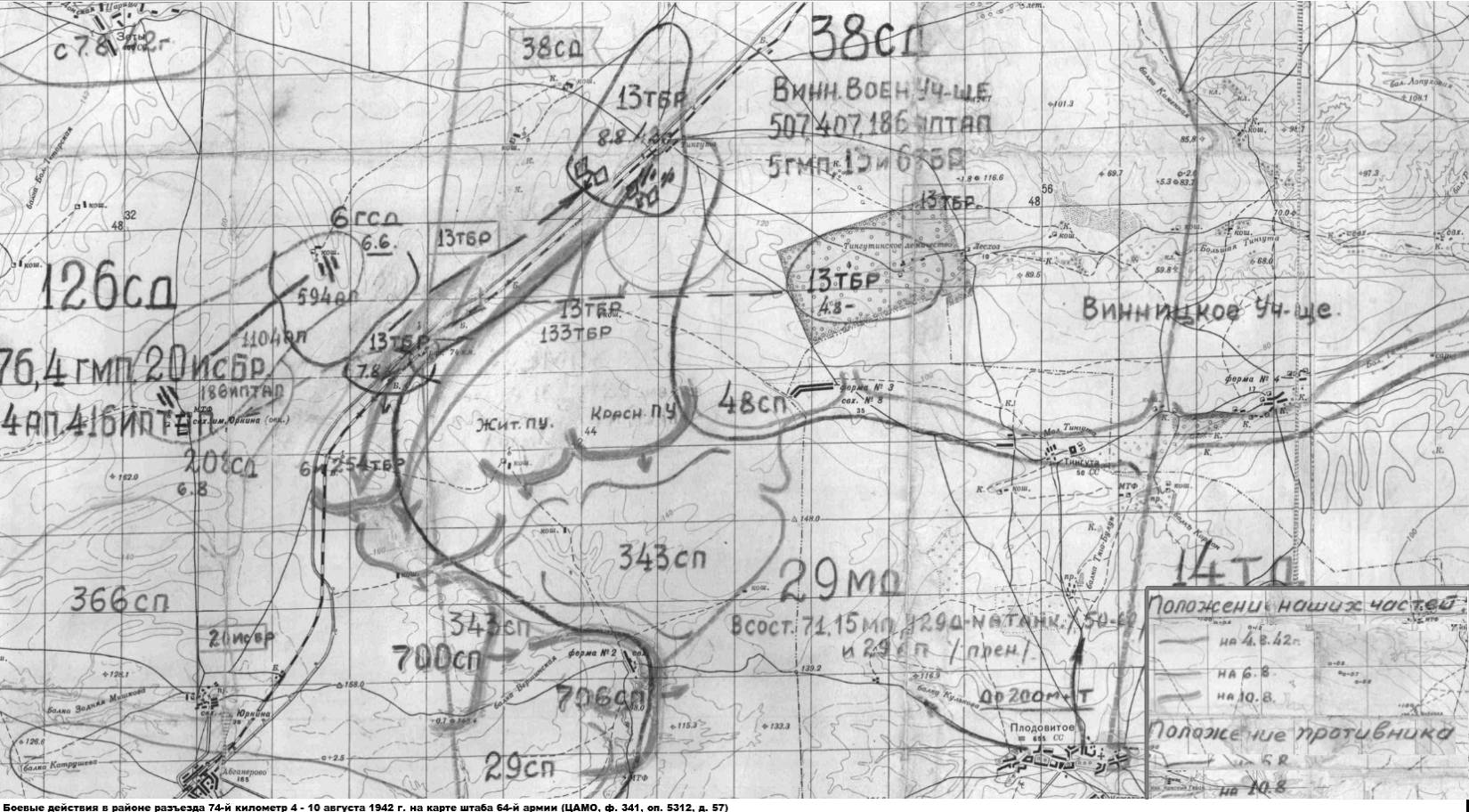 Боевые действия в районе разъезда 74го километра 4–10 августа 1942 года на карте штаба 64й армии (ЦАМО, ф. 341, оп. 5312, д. 57)