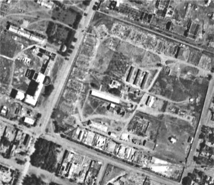 На немецкой аэросъемке хорошо видны места располагавшихся бараков концлагеря №162, в которых нацисты заживо сожгли советских военнопленных