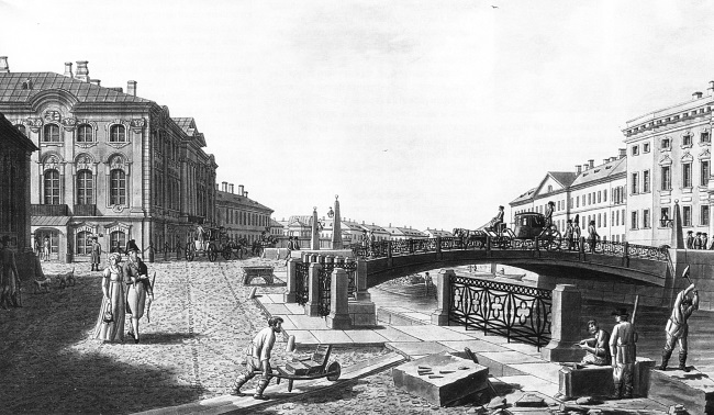 Строительство этого однопролетного арочного сооружения вел И.М. Голенищев-Кутузов. (Мост расширен в 1805-1806 годах архитектором Л. Руска.) Парадное оформление основных протоков в центре Петербурга завершилось в 1798-1810 годах благоустройством Мойки.
