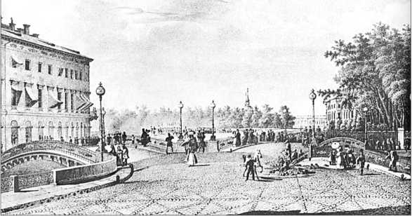 Проект этот в 1819 году был принят к исполнению. На чугунолитейном заводе в Олонце заказали металлические части мостов[13]. Однако к строительству тогда так и не приступили. Возможно, это объяснялось тем, что как раз в то время проводилось коренное преобразование всей прилегающей территории на левом берегу Мойки, поглощавшее большие силы и средства.