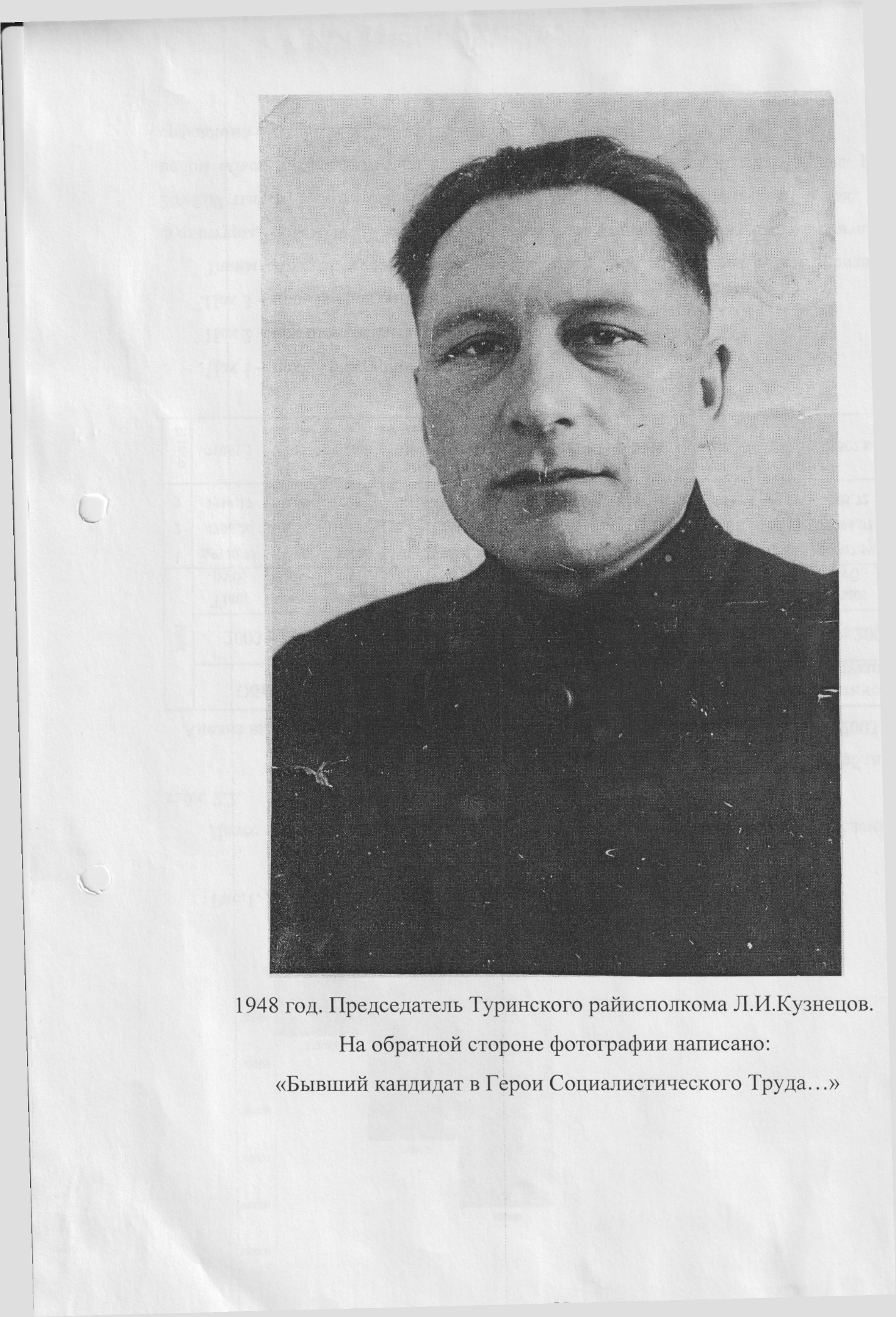 1948 год. Председатель Туринского райисполкома Л.И.Кузнецов. На обратной стороне фотографии написано: «Бывший кандидат в Герои Социалистического Труда…»