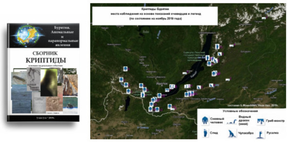 В 2019 году, на основе собранной информации, мной был составлен сборник «Криптиды», выложенный в свободный доступ. Его результатом стала карта «Криптиды Бурятии места наблюдения на основе показаний очевидцев и легенд (по состоянию на ноябрь 2019 года)». Это стало началом ликвидации «белого пятна» на карте криптозоологической изученности Бурятии и Байкала.