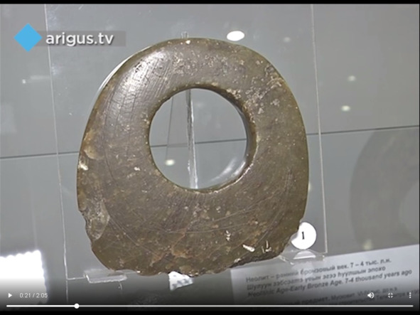 Этот предмет из мусковита – слюды, относящийся к неолиту – раннему бронзовому веку (7000—4000 лет), нашли в Улан-Удэ при строительстве телевизионного центра в 1961 году. Для чего он использовалось, ученым установить не удалось.