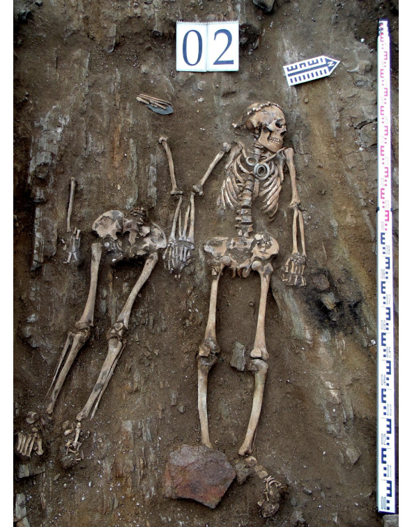 – металлическое изделие. В 2 см к востоку от верхнего эпифиза большой берцовой кости (в районе правой коленки) отмечено металлическое изделие (из бронзы или меди?) цилиндрической формы, помещенное в кожаную сумку/чехол. В целях сохранения изделия предмет был извлечен вместе с землей и законсервирован. Реставрационные работы еще не проведены.