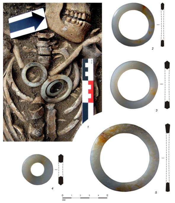 – кольца из светлого нефрита. В левой глазнице найдено одно кольцо из светлого нефрита. Размеры изделия: внешний диаметр 3,5 см, внутренний диаметр 1,6 см, толщина 0,5 см. На груди погребенного обнаружено три крупных кольца из светлого нефрита, одно из которых (внешний диаметр 5,5 см, внутренний диаметр 3,6 см, толщина 0,6 см) расположено к юго-западу от позвоночного столба, два других – одно вложено в другое – к северо-востоку. Размеры самого большого кольца: внешний диаметр 7,8 см, внутренний диаметр 5,5 см, толщина 0,3—0,5 см. Размеры вложенного кольца: внешний диаметр 5,0 см, внутренний 3,3 см, толщина 0,2—0,4 см (прим. – три кольца составляют комплект вкладывающихся друг в друга).