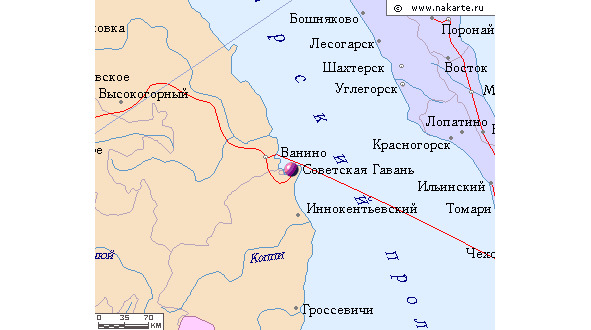 Мы жили на полуострове Меньшиков, который искусственным перешейком был соединен с материком в районе залива Советская Гавань и расположенного на его берегу города Советская Гавань. Туда перевели служить моего отца. Это была база Военно-Морского Флота на Дальнем Востоке. На карте слева – материк, через Татарский пролив – остров Сахалин.