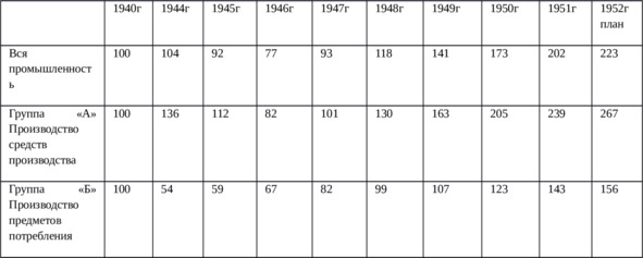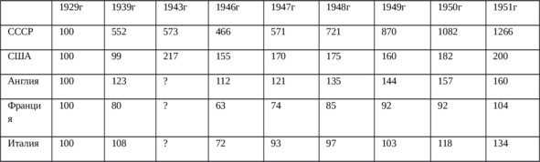 За год до смерти Сталина состоялся XIX Съезд ВКП (б). В докладе, с которым выступил Маленков, в разделе «Международное положение Советского Союза» были приведены следующие данные. Рост промышленной продукции в СССР и капиталистических странах за 1929—1951 годы (в процентах к 1929 году):