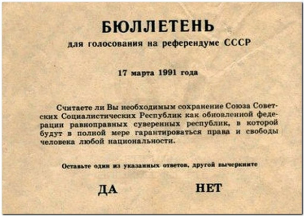 Рассмотрев сообщение Центральной комиссии референдума СССР об итогах первого в истории нашей страны референдума 17 марта 1991 года по вопросу о сохранении Союза Советских Социалистических Республик как обновленной федерации равноправных суверенных республик, в которой будут в полной мере гарантироваться права и свободы человека любой национальности, Верховный Совет СССР отмечает высокую активность и гражданскую ответственность участников всенародного голосования.