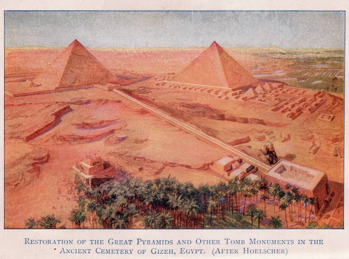 Реконструкция комплекса пирамиды Гизы. Изображение из статьи Википедии «Пирамиды Гизы» (Автор: Sue Clark – Flickr: Fixed Image of Pyramids, Общественное достояние, https://commons.wikimedia.org/w/index.php?curid=16126067)