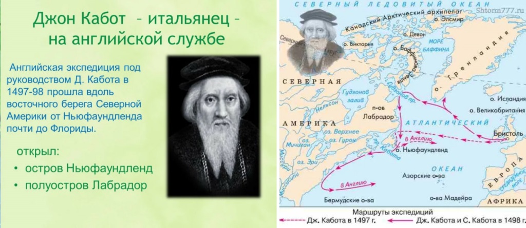 Джон Кабот (John Cabot) одновременно итальянский и французский мореплаватель, купец и работорговец на службе английской короны, впервые исследовал побережье Северной Америки (современной Канады). Английская экспедиция Джона Кабота достигла берегов нынешней Канады в Северной Америке в 1497 году, через пять лет после открытия Америки Колумбом.
