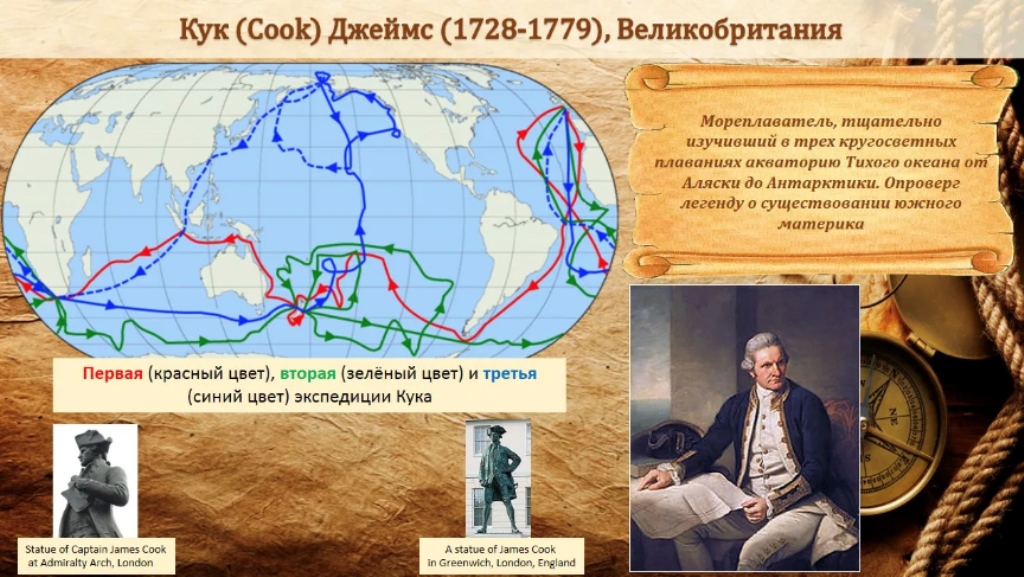 Капитан Джеймс Кук был великим мореплавателем, он возглавлял три кругосветные экспедиции по исследованию Мирового океана, совершил ряд географических открытий, обследовал многие регионы в разных точках планеты, составил множество точнейших карт, которые по своей точности и аккуратности не имели аналогов на протяжении многих десятилетий и служили мореплавателям вплоть до конца ХIХ века.