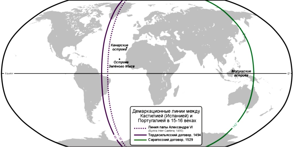 Меридианы, которые служили демаркационными линиями, разделяющими весь нехристианский мир между Кастилией (Испанией) и Португалией по Тордесильясскому договору от 1494 года и Сарагосскому договору от 1529 года