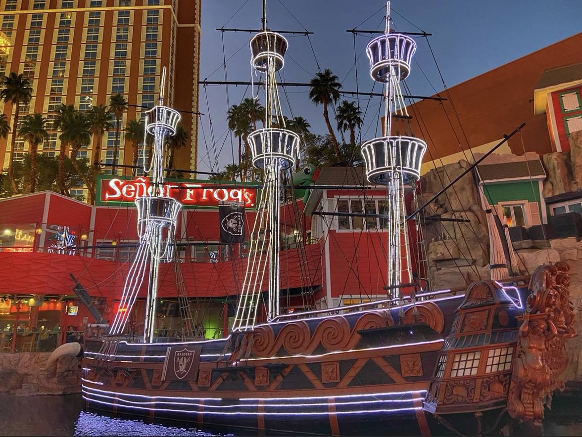 На территории отеля «Остров сокровищ» можно полюбоваться копиями пиратских кораблей, где устраивались реконструкции морских сражений.