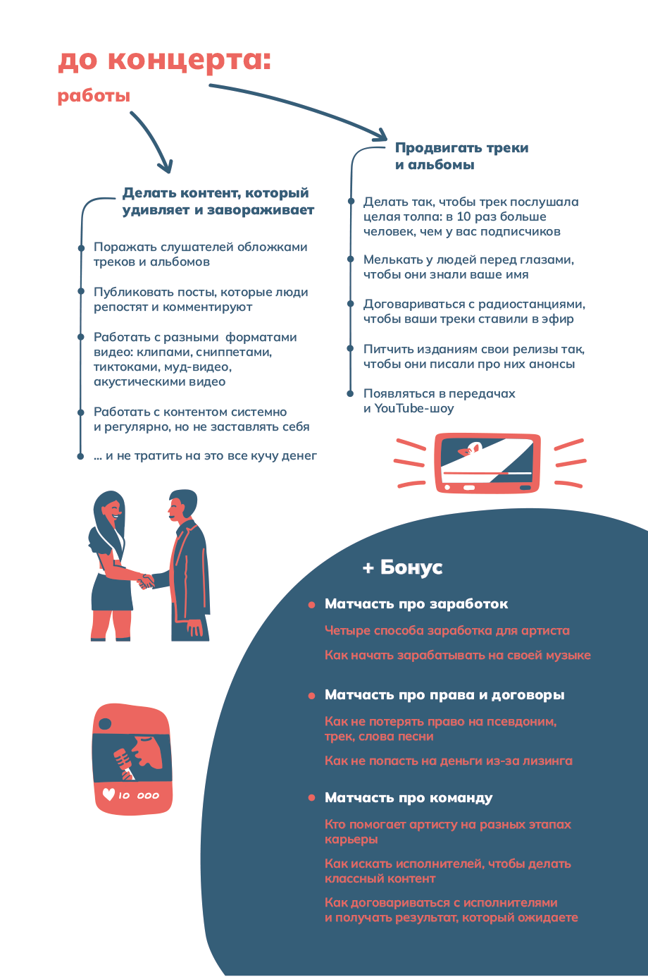 В книге мы постарались собрать весь наш опыт и организовать его в систему: с чего начать карьеру артиста, какие вопросы задать себе на старте и на что потратиться в первую очередь. Надеемся, вы сможете увидеть картинку целиком: как разные элементы продвижения работают все вместе и как одно связано с другим. Чтобы найти конкретные примеры для разных глав, мы подключали ребят из нашего агентства: таргетологов, продюсеров, дизайнеров. Так что все, что здесь описано, собрано на основе реального рабочего опыта.
