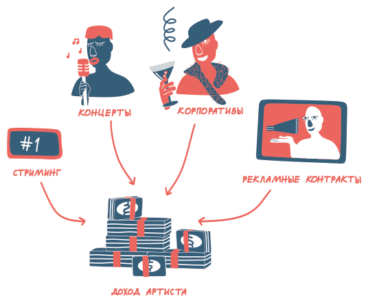 Обычно заработок музыкантов состоит из трех потоков: стриминг, рекламные контракты и выступления – например, корпоративы и концерты. Для каждого способа свои стратегии продвижения. Для стриминга нужно выпускать как можно больше хитов, попадать в тренды, нравиться массам. Но не обязательно, чтобы люди знали вас как личность. А вот для концертов лучше выстраивать со слушателями нежные и тесные отношения: так выше вероятность, что они придут на выступление артиста, а не предпочтут другое развлечение. На корпоративы зовут тех, кто на слуху и у кого музыка подходит под формат.