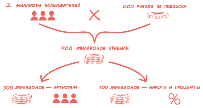 Пусть 30 миллионов уйдут на налоги. Еще 70 миллионов сервис заберет себе как комиссию: надо же платить программистам, маркетологам, менеджерам и покупать печеньки в офис. Осталось 300 миллионов рублей: их «Музловичкофф» должен выплатить артистам.