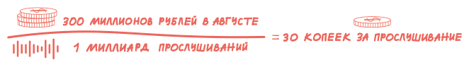 У нас есть общая выплата артистам и количество прослушиваний. Нужно узнать, сколько стоит одно прослушивание. Берем общую выплату – это 300 миллионов рублей. Делим на прослушивания – миллиард. Получается, в августе одно прослушивание стоило 30 копеек.