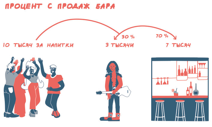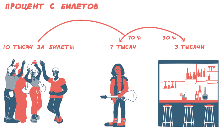 Еще бывает процент с продаж у бара. Вот пришли 20 человек на концерт. Один купил пиво, другой апероль, и так много заказов. Бар заработал 10 тысяч рублей, а артист получил с этого процент: пусть 3 тысячи. Известные артисты чаще просят гонорары – фиксированную сумму за один концерт. Гонорар с концертов – от 100 тысяч рублей до нескольких миллионов у суперзвезд.