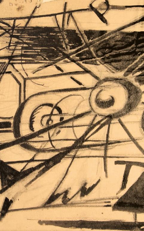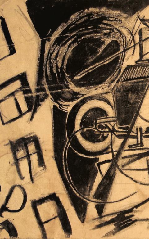 А на промозглой ряби серо-защитной мути усталой вечности каторжной чуткости маховых будней лопающиеся пузыри сумасшедшего грохота с вздувшимися жилами проводов на клепаных[3] лбах дневного ожога громовых памятей в клетчатых лохмотьях гремящей гари фабричных корпусов. Удушливые взрывы прессованного грохота, чугунная мелодия ночного дрожания арсеналов и верфей, солнцегремящих броневиков из прокованных туч <нрзб.> молний за пристальными зрачками чутких орудий в кружевных кофточках блестящих механизмов, захлебывающиеся визги восторженных пулеметов, победные петли никелированных метеоров с оглушительно орущими пропеллерами, прихотливо вырезанными из неба разноцветными крыльями, прошитыми серебряной проволокой истерик арсеналов и верфей. Металлические здания громоносной улицы, ухабисто мощеной черепами издохших планет – громоносная четкость улицы пантеизма, гудящей двигателями столицы, накокаиненной истерикой смеющейся поступи мерного синтеза Сиятельной Вечности с сбившимся в астрономическом беге шиньоном дыма.