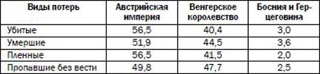 В 1914 году население Австро-Венгрии распределялось следующим образом: Австрийская империя – 55,3 %, Венгерское королевство – 41,2 %, Босния и Герцеговина (территория, управляемая совместно Австрией и Венгрией) – 3,5 %. Согласно оценке австро-венгерского Военного министерства, потери распределялись между этими территориями следующим образом[101]: