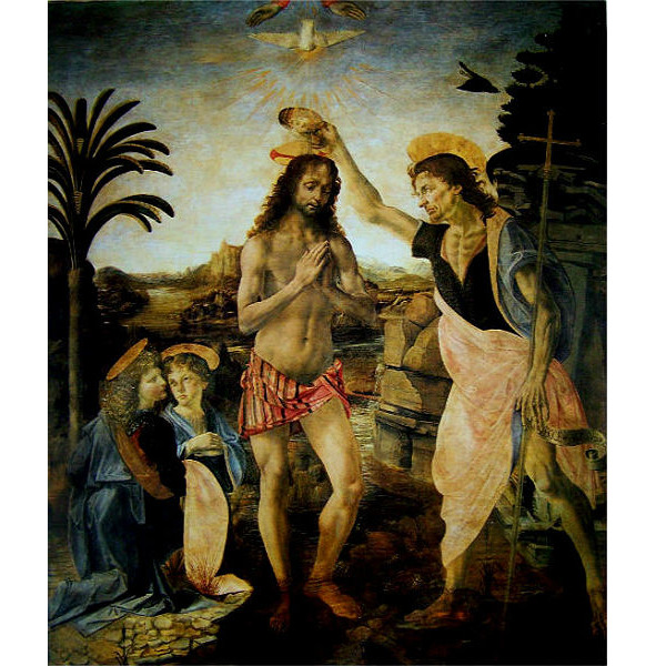 Картина известная и весьма примечательная. В работе над ней принимали участие, как минимум, ещё два человека: Леонардо да Винчи и Сандро Боттичелли. Был ещё кто-то, изобразивший руки Бога вверху. Кисти Верроккьо принадлежит Иоанн Креститель и пейзаж за ним, Леонардо – Иисус, ангел слева (с туникой в руке) и пейзаж левой половины картины; Боттичелли – второй ангел. Таково мнение искусствоведов.