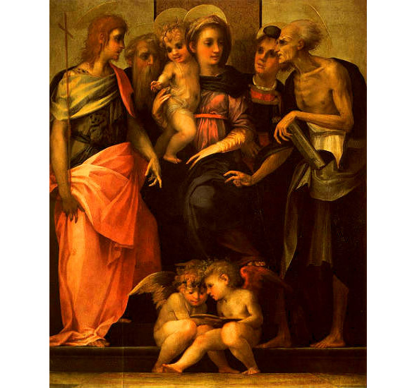 Россо Фьорентино. «Мадонна на троне со Святыми Иоанном Крестителем, Антонием Аббатом, Стефаном и Иеронимом («Пала ди Санта Мария Нуова», Галерея Уффици. 1518 г.)