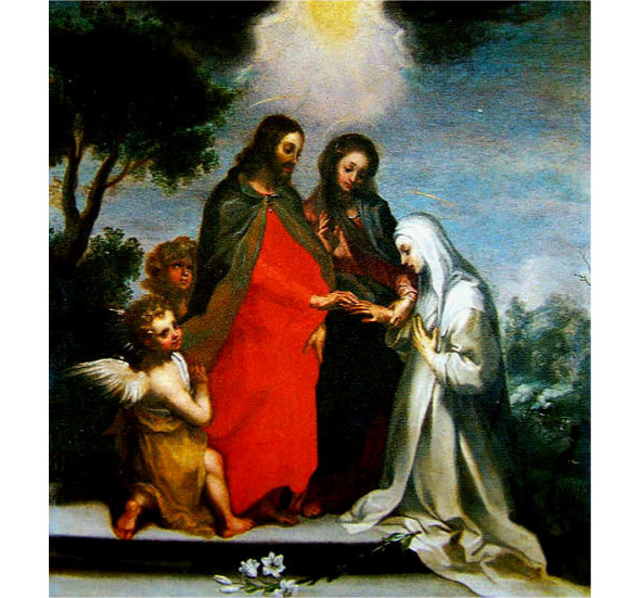 Здесь все иначе, чем у Пармиджанино. Действие происходит на фоне прекрасного пейзажа. Иисус Христос – мужчина в расцвете лет: доброжелательный, величественный и божественно снисходительный. Екатерина (уточним: речь идёт уже о Екатерине Сиенской) – смиренная, благообразная монахиня, вполне сознающая своё ничтожество. Ощущение чего-то мистического создается чисто внешними факторами: расступающимися черными тучами, золотым сиянием, исходящим от самого Бога, благословляющего совершающееся на наших глазах чудо. Всё очень спокойно, умиротворенно и возвышенно.