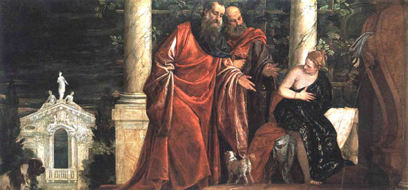 Тинторетто не пытается охватить все и вся, как его предшественник, а сосредотачивается на одном, наиболее пикантном моменте. Два престарелых служителя Фемиды боязливо подглядывают за пышнотелой блондинкой, которая, в свою очередь, рассматривает себя в зеркале. В венецианском, надо полагать, что намекает на ее статус. Конечно, коварство в позах домогателей прослеживается. Но то ли их гнусные замыслы ещё окончательно не сформировались, то ли они уже испугались задуманного. Как-то не верится, что эти двое могут сотворить нечто страшное с девицей столь восхитительного телосложения. Скорее, это им не поздоровится. С их-то комплекцией…