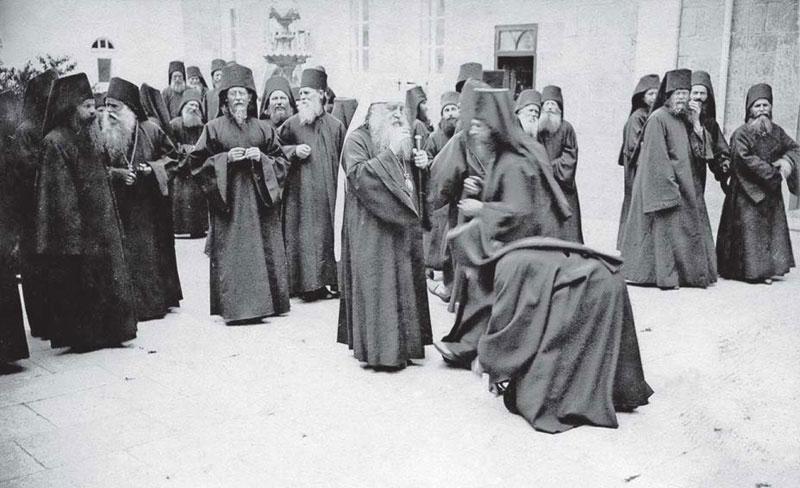Митрополит Антоний Храповицкий благословляет братию Пантелеимонова монастыря после трапезы. 1920 г.