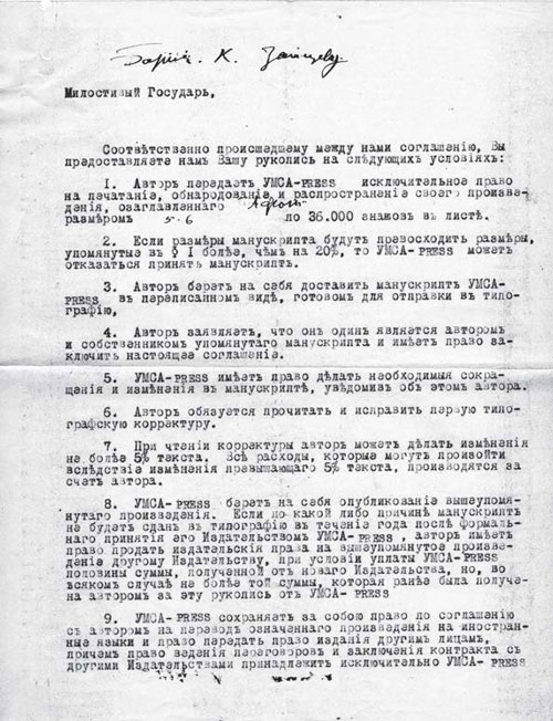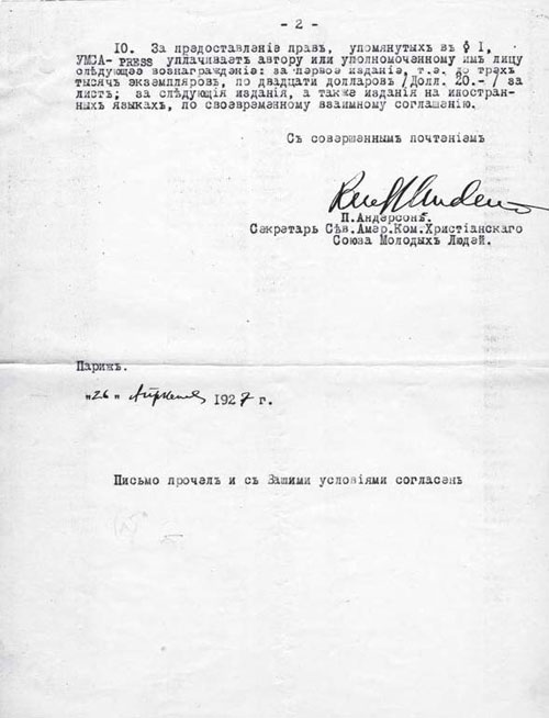 Вскоре Зайцев заключил с издательством американского Христианского союза молодых людей (YMCA) договор на публикацию своего отчета об афонском странствии отдельной книгой. «Это один из тех писателей, которые работают по старинке, не думая о том, найдут ли они издателя и как разойдется написанная книга в Париже и Берлине»[45], – полагал интервьюировавший Бориса Константиновича Яков Цвибак. По-видимому, автора, напротив, очень волновала судьба рукописи о Св. Горе и возможность скорейшего появления ее в виде книги, так что обычно весьма щепетильный в отношениях с издательствами, Зайцев согласился на малопривлекательные условия издательства YMCA-Press, изначально ограничившего автора малым объемом текста… Книгу с рабочим названием «Афон» предполагалось выпустить объемом в 5–6 печатных листов по 36.000 знаков в листе[46]. Определено было, что «если размеры манускрипта будут превосходить размеры, упомянутые в § 1 более, чем на 20 %, то YMCA-PRESS может отказаться принять манускрипт»[47], причем «при чтении корректуры автор может делать изменения не более 5 % текста. Все расходы, которые могут произойти вследствие изменения превышающего 5 % текста, производятся за счет автора»[48]. Даже в случае не выпуска книги издательством по не зависящим от автора причинам Зайцев соглашался, что будет иметь право передать рукопись другому издательству лишь «при условии уплаты YMCA-PRESS половины суммы, полученной от нового Издательства», а также передавал YMCA-PRESS «право ведения переговоров и заключения контракта с другими Издательствами» на переиздание книги и переводы ее на иностранные языки[49]. Авторский гонорар был вполне эфемерным и лишь покрывал непредвиденные расходы на обратную дорогу из Греции: «За предоставление прав, упомянутых в § 1, уплачивает автору или уполномоченному им лицу следующее вознаграждение: за первое издание, т. е. до трех тысяч экземпляров, по двадцати долларов /Долл. 20. – / за лист; за следующие издания, а также издания на иностранных языках, по своевременному взаимному соглашению»[50]. Договор был подписан секретарем YMCA П. Андерсоном 26 апреля 1927 г.
