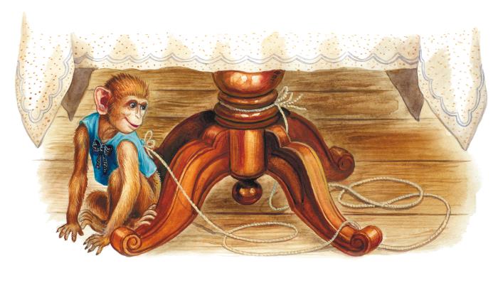 Ух, как он начал скакать! Но где ему было порвать верёвку! Он покричал, позлился и сел печально на полу.